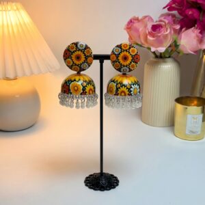 Handpainted Meenakari Work Yellow Flower design with Pearl Ghunghru Jhumka