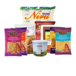 Items: Daawat long grain basmati rice – 5Kg or Aashirwad multigrains atta – 5Kg , Toor dal – 1Kg, Channa dal – 1Kg, Sugar tate & lyle – 2 Kg, KTC Vegetable oil – 5 Liters, Salt – 750g, Maggi – 3Packs, Masalas 3type – Aachi Meat, TRS Garam and Aachi Sambar, Snacks – Bombay mix and Softy chakli, Tata premium tea – 400g, Parle G – 5 Packs.