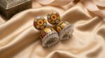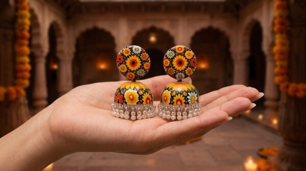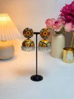 Be the first to review “Handpainted Meenakari Work Yellow Flower design with Pearl Ghunghru Jhumka”