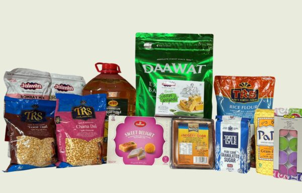 Items: Daawat long grain basmati rice – 5Kg, Vegetable Oil – 5Liter, Toor dal – 1Kg, Channa dal – 1Kg, Besan – 1Kg, Rice flour – 1.5kg, Sugar – 1Kg, Jaggery – 1Kg, Haldiram’s sweet delight – 300g, Soan papdi – 250g, Softy chakli, Bombay mix, Colour wax candle set (10Pcs).