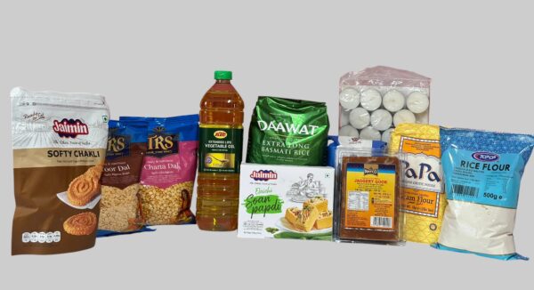 Items: Daawat long grain basmati rice – 2Kg, Vegetable Oil – 1Liter, T00r dal – 500g, Channa dal – 500g, Besan – 1Kg, Rice flour – 500g, Sugar – 1Kg, Jaggery – 500g, Soan papdi – 250g, Softy chakli, Candle set (20Pcs).