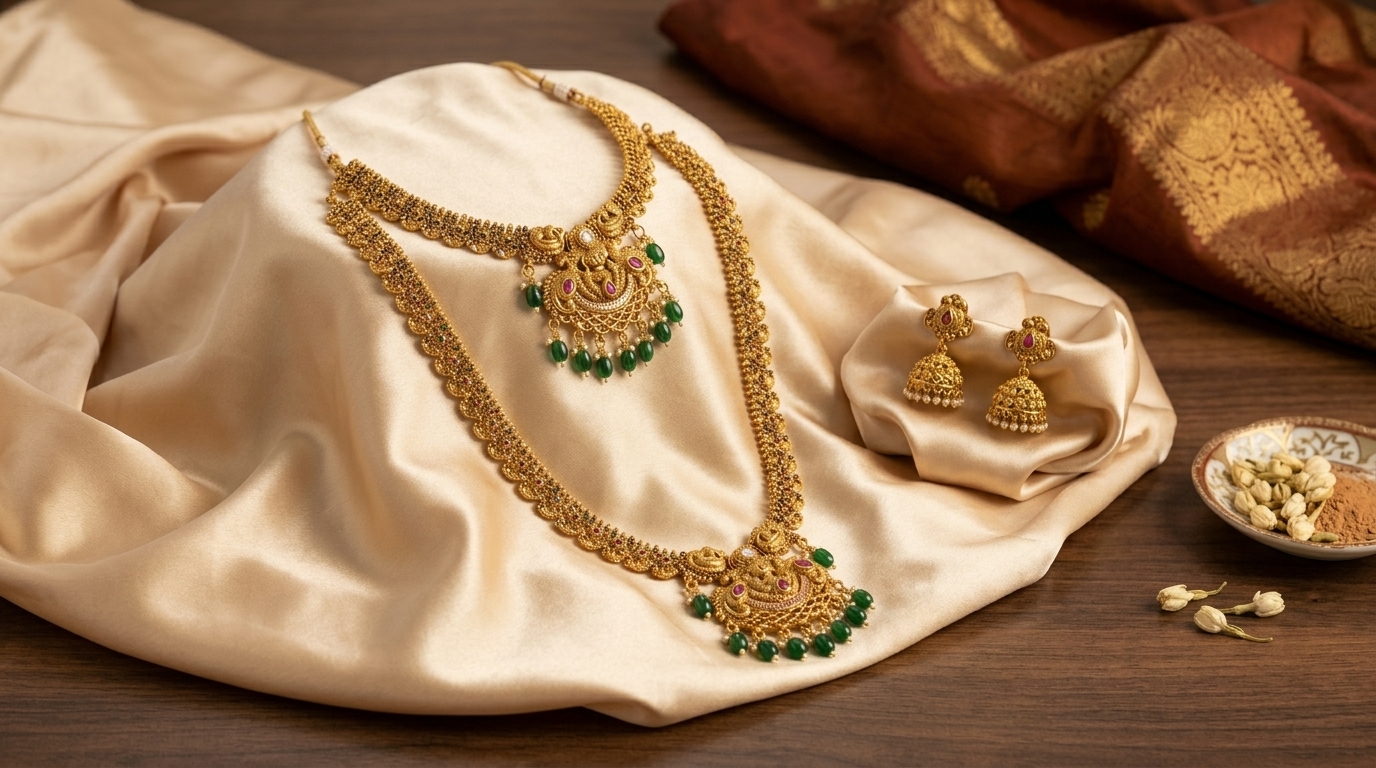 Embrace timeless tradition with this exquisite handcrafted gold‑tone jewellery set, designed with intricate detailing and vibrant gemstone accents. The set features two beautifully layered necklaces adorned with red and green stones, complemented by delicate bead drops that add a regal touch. Paired with matching  jhumka earrings, the ensemble captures the essence of classic Indian craftsmanship, making it ideal for weddings, festive celebrations, and cultural occasions.